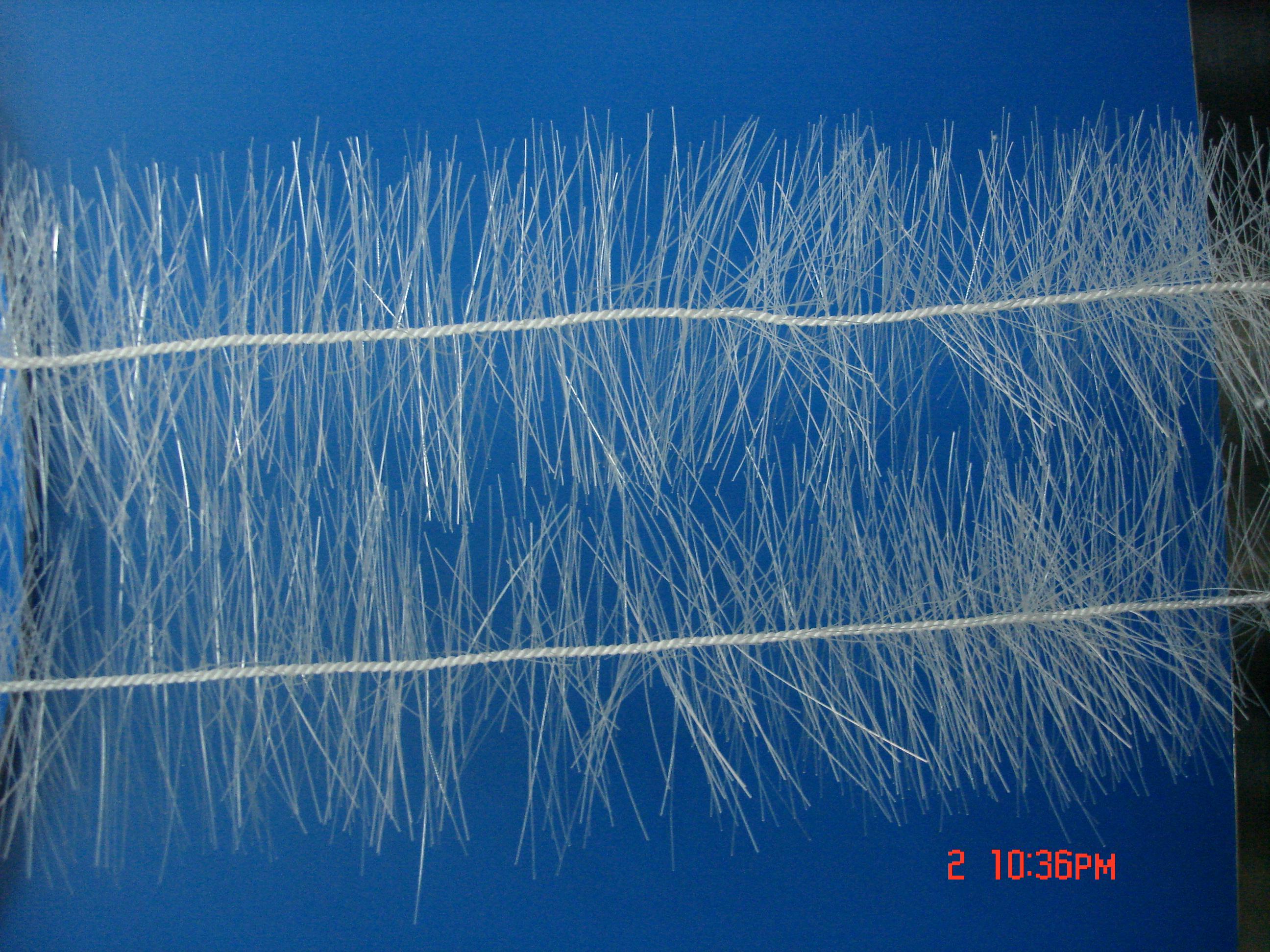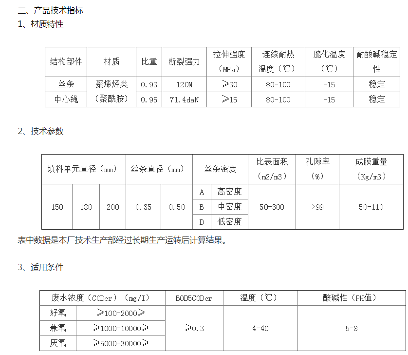 該填料篩選了聚烯烴類(lèi)和聚酰胺中的幾種耐腐、耐溫、耐老化的品種,混合以親水、吸附、抗熱氧等助劑,采用拉絲,絲條制毛工藝,將絲條穿插固著在耐腐、高強(qiáng)度的中心繩上,絲條布置應(yīng)呈立體狀,絲條表面應(yīng)有微波紋,由于選材和工藝配方精良,剛?cè)徇m度,使絲條呈立體均勻排列輻射狀態(tài),制成了懸掛式立體彈性填料的單體,填料在區(qū)域內(nèi)能立體均勻舒展?jié)M布,使氣、水、生物膜得到充分混滲接觸交換,生物膜不僅能均勻地著床在每一根絲條上,保持良好的活性和空隙可變性,而且能在運(yùn)行過(guò)程中獲得愈來(lái)愈大的比表面積,又能進(jìn)行良好的代謝,這一特征與現(xiàn)象是國(guó)內(nèi)目前其他填料不可比擬的。